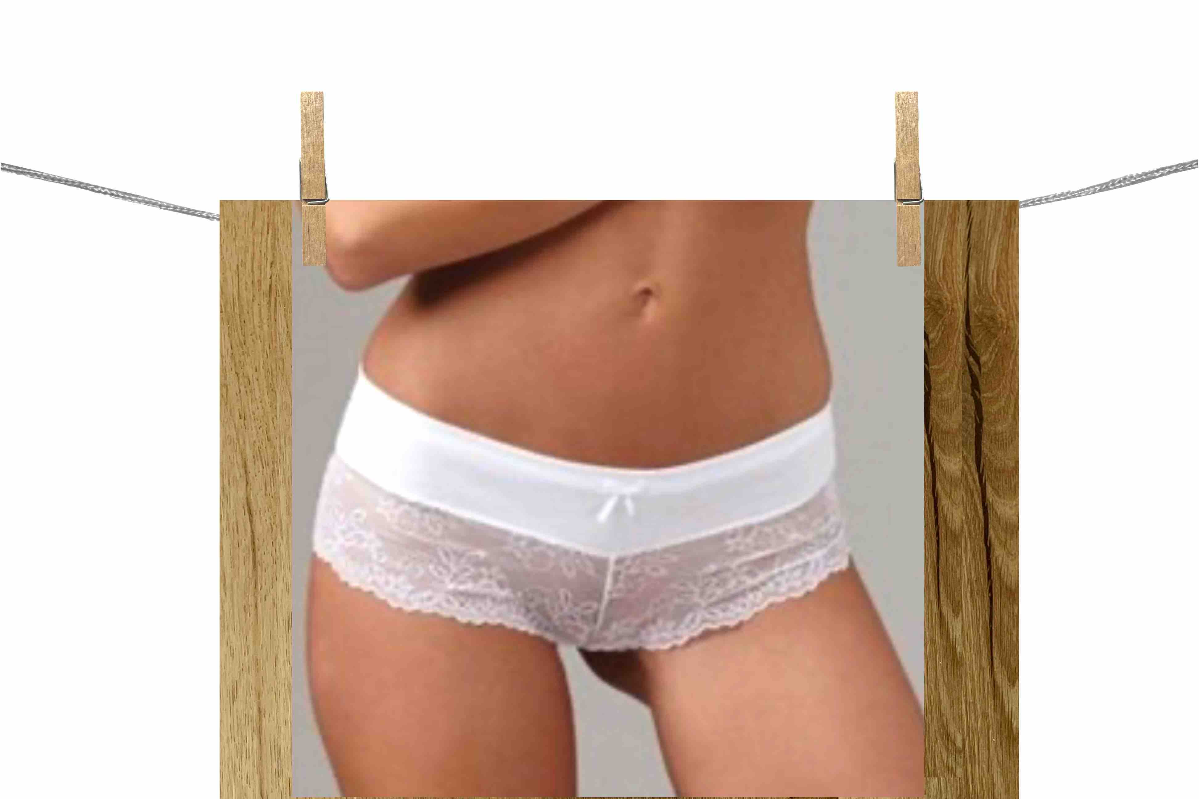 Kombinace materiálů: Pas je tvořen pevnou a prodyšnou bavlnou (90 %), spodní polovina kalhotek přechází v širokou, jemnou a vysoce elastickou krajku.